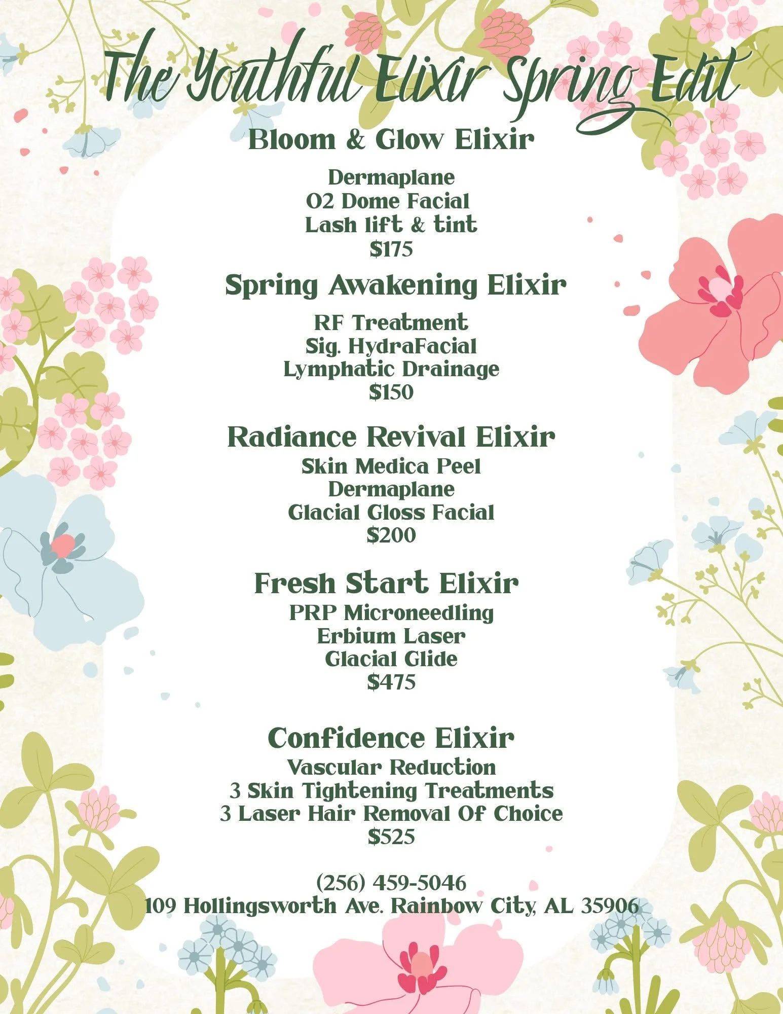 SEASONAL SPECIALS Limited-time deals designed to renew, refresh, and reveal your best skin. 6 Brazilian Laser Treatments and 6 Full Leg Laser TreatmentsBoth packages for just $650 Call to schedule your appointment today! 256-459-5046
